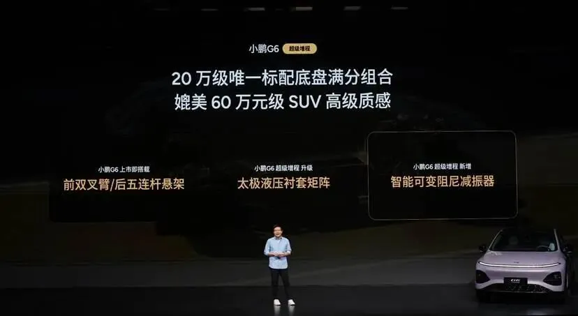 底盘调校上,小鹏G6超级增程搭载AI太极底盘,是同级首个将高阶智驾感知深度接入底盘控制的系统级方案。全系标配前双叉臂、后五连杆独立悬架,搭配可变阻尼减振器与太极液压衬套,可根据路况实时调节悬架软硬,所以让日常驾驶起来的质感既能舒适,又能兼顾操控。