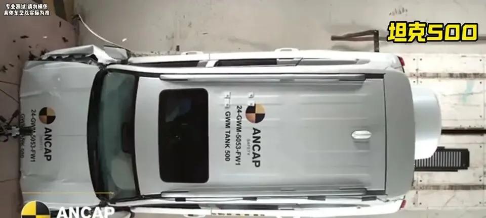 坦克500这边,情况更刺激一点,车顶横梁变形幅度甚至更大,不过好在侧气囊和中央气囊都弹了出来,只是驾驶员肩部和手臂同样受到了挤压。