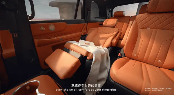 细节部分,该车的豪华感营造得比较到位,大面积使用了缝线真皮、菱格纹内饰,还配有头枕音响、二排吸顶娱乐屏、零重力座椅、门板无线充电等。