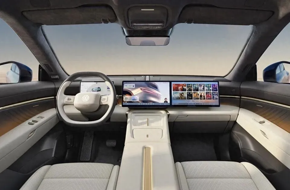 新车的内饰使用了大众新能源车型最新的设计风格,中控台造型简约立体,使用了悬浮式的液晶仪表盘,另外还使用了悬浮式的中控屏和副驾大屏双联屏设计,屏幕后部带有贯穿式镀铬装饰,和车门上的饰条相呼应。