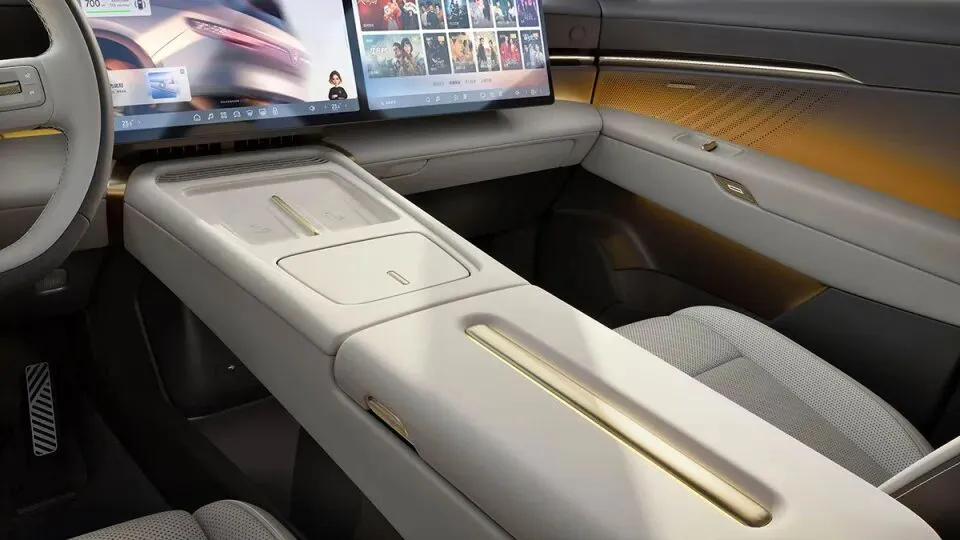 空调出风口使用了隐藏式风格,两幅式方向盘的盘幅使用了双色皮质包裹,有着不错的精致感。副中控台是立体结构设计,上部的扶手箱以及手机无线充电板位置带有金色的中轴线式的饰条。