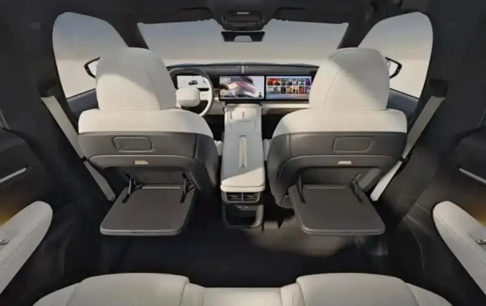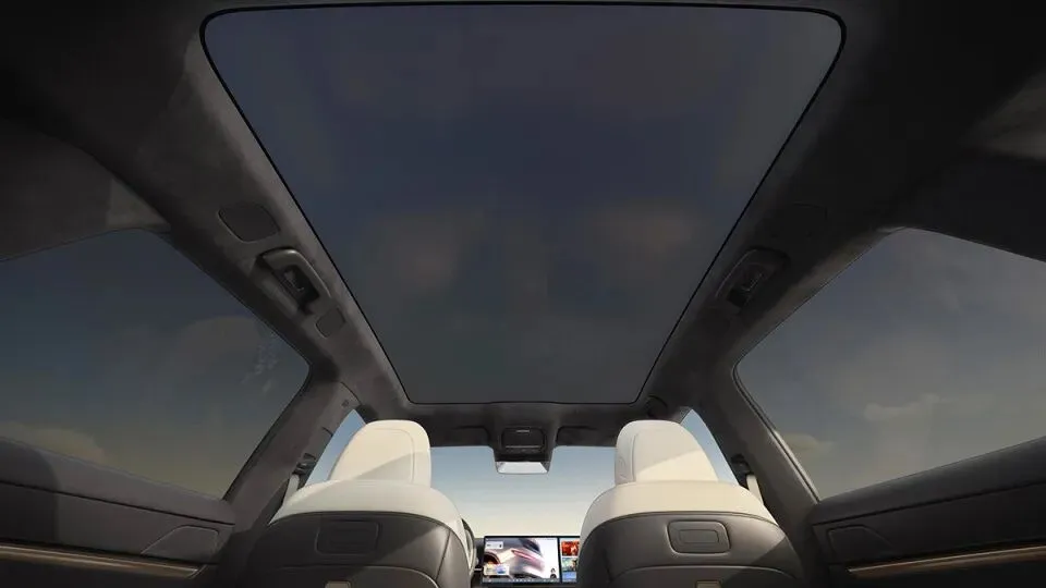 后排地板很平整,提供了折叠式的小桌板,车顶则是全景天幕。