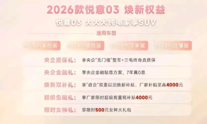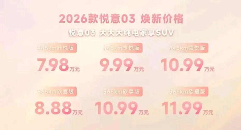 3月8日,一汽奔腾2026款悦意03正式迎来上市,新车定位紧凑型纯电SUV,基于越影平台打造,官方指导价锁定7.98-11.99万元,推出445km、565km两种续航版本共6款车型。作为年度改款车型,新车不仅新增潮流配色,还围绕家庭出行需求完成了辅助驾驶、安全、舒适等维度的20余项配置升级,更叠加央企专属购车权益,成为10万级纯电家用SUV市场的高性价比之选。此次改款,奔腾悦意03在颜值与内饰质感上迎来焕新,尤其贴合家庭女性用户的审美偏好。外观新增晨晖金车身配色,搭配原有雀舌翠、云海白、山涧银、星云青四款色系,五款车色兼顾时尚与耐看,适配日常通勤、家庭出游等多种场景。内饰则新增晨曦白配色,与原有风格形成三款内饰选择,整体设计简约大气,居家氛围感拉满,大量亲肤材质的运用也让触感更细腻,打造出温馨的移动座舱体验。空间表现向来是家用车的核心考量,奔腾悦意03在紧凑型SUV的定位下,交出了亮眼的空间答卷。新车车身尺寸为4450×1860×1635mm,轴距达2750mm,越级轴距带来宽敞的驾乘空间,同时车内精心设计22处储物格,随手可放水杯、手机、儿童用品等小物件,415L的后备箱空间更是能轻松容纳婴儿车、露营装备等大件物品,满足家庭出行的储物需求。此外,新车还配备3.3kW对外放电功能,露营时可轻松带动电煮锅、投影仪等设备,让户外出行更有乐趣。智能化与实用性配置的全面升级,是此次改款的一大亮点。车内搭载全液晶仪表盘+14.6英寸中控大屏的组合,车机系统支持高德导航、HUAWEI HiCar、Carlink等功能,手机车机无缝互联,操作便捷。智能语音更是依托Deepseek接入AI大模型,能精准理解自然语音指令,哪怕是复杂的出行需求也能快速响应,彻底解放双手。同时,新车配备360°全景影像、外后视镜折叠加热、NFC/蓝牙钥匙等实用配置,其中NFC/蓝牙钥匙解决了带娃出行腾不出手开门的痛点,细节处尽显贴心。新车新增并线辅助、盲区监测功能,搭配原有安全配置,全方位降低行车风险,即便是新手司机也能从容驾驶;座椅方面,前排配备加热功能+主驾通风功能,夏天告别闷热、冬天远离冰凉,后排座椅则增加15mm软泡层,坐垫更柔软、支撑更扎实,老人孩子乘坐也能更舒适,长途出行不再疲惫。动力方面,2026款奔腾悦意03延续了成熟可靠的动力配置,搭载极鸥八合一电驱,匹配逐日动力BMP超能纯电系统,电机最大功率122kW,最高车速160km/h,整车电耗低至11.8kWh/100km,兼顾动力与能耗。电池全系采用磷酸铁锂动力电池,提供48.35kWh、61.47kWh两种容量版本,对应CLTC纯电续航445km、565km,日常通勤完全能实现零油耗,短途出游也无需担心续航焦虑,同时电池包通过新国标安全测试,用车更有保障。为了让消费者购车更省心,官方还推出了重磅焕新权益,背靠央企的品牌优势带来满满诚意:享受无门槛整车+三电终身质保,彻底打消后期用车顾虑;央企金融贴息方案支持7年0息,大幅降低购车首付与月供压力;同时还可叠加4000元购置税补贴、以旧换新补贴等福利,多重权益叠加,进一步拉满性价比。作为一款专为家庭用户打造的纯电SUV,2026款奔腾悦意03精准踩中了家庭出行的核心需求:大空间、长续航、高配置,再加上亲民的定价与央企专属权益,在10万级纯电市场中形成了独特的竞争优势。尤其针对家庭女性用户的审美与使用痛点进行的细节升级,让这款车不仅是一台出行工具,更成为家庭生活的贴心伙伴。对于追求省心、实用、高性价比的年轻家庭而言,这款新车无疑是值得重点考虑的选择。点赞+在看,把这款高性价比家用纯电SUV分享给身边准备买车的朋友;评论区聊聊,你觉得奔腾悦意03的哪项配置最贴合家庭出行需求?