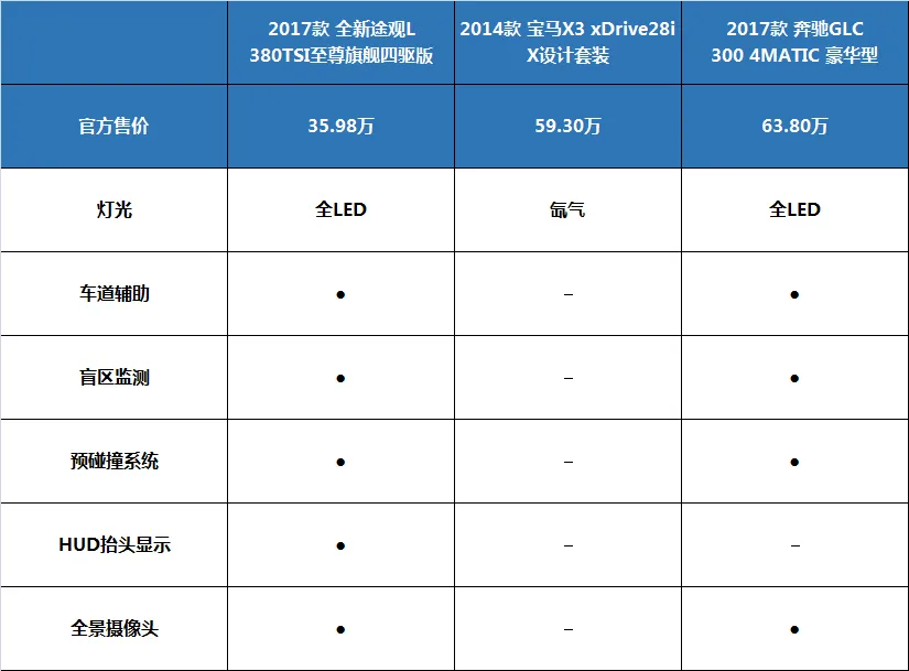 例如GLC高配才有的LED灯,在途观L这三款配置中都是标配,而宝马X3依然是氙气灯。还有GLC上的安全配置:车道辅助、盲区监测、预碰撞系统等等,都能在途观L上有所体现。