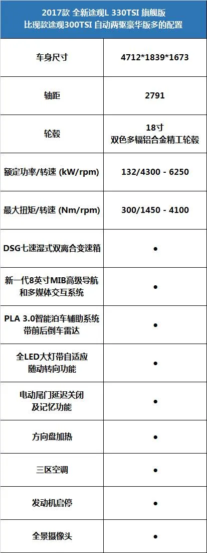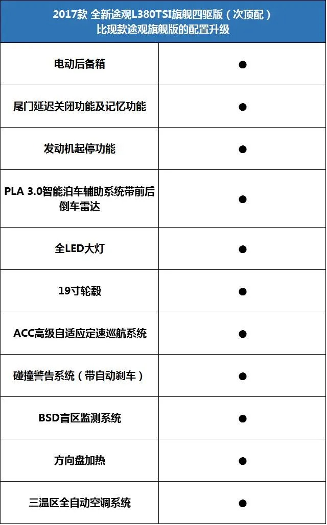 不过与现款途观旗舰版对比我们不难发现,它还是有明显的提升:首先车身尺寸上,途观L已经极具优势了,动力方面,380TSI较之现款途观也多了15额定功率与70峰值扭矩;另外还有19寸轮毂、电动尾箱、全LED大灯、盲区监测等等,就尺寸和动力已经足够诚意,其他的配置更是大幅拉开等级。