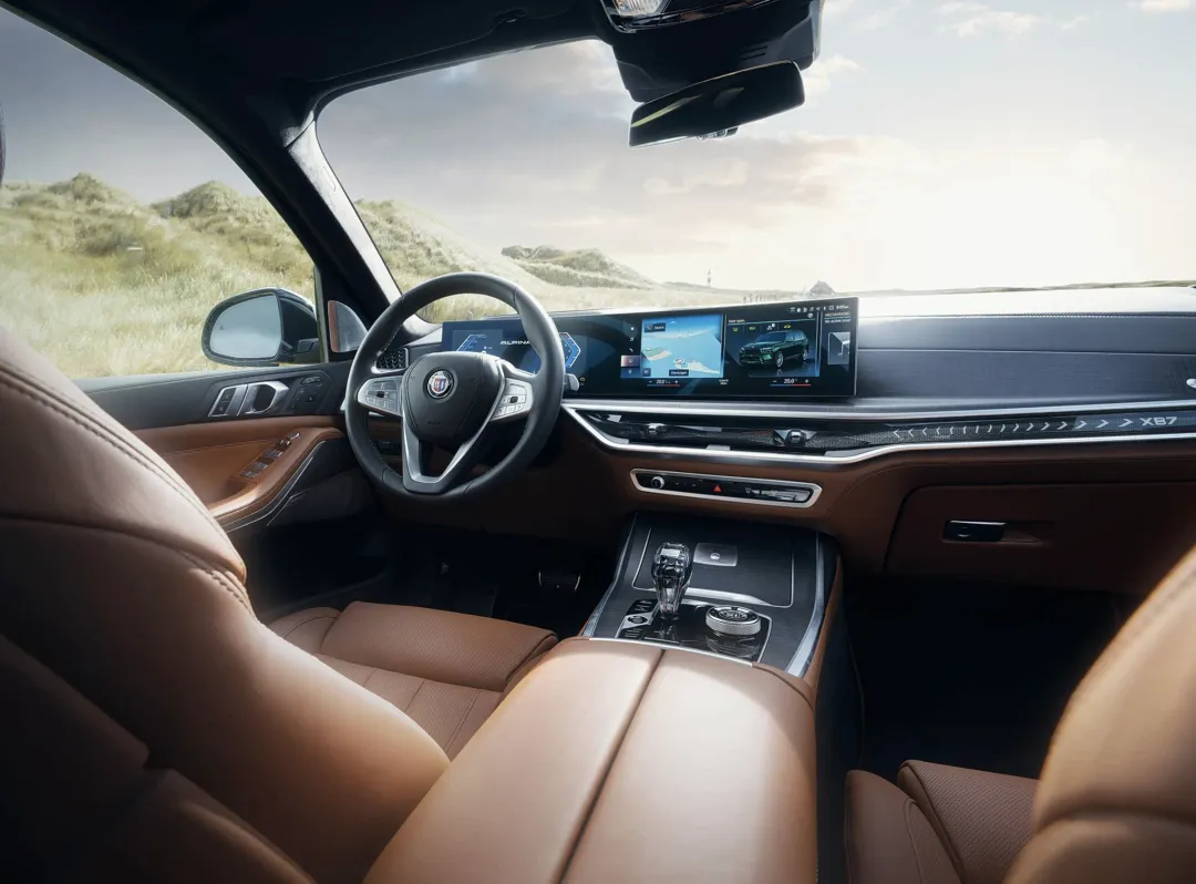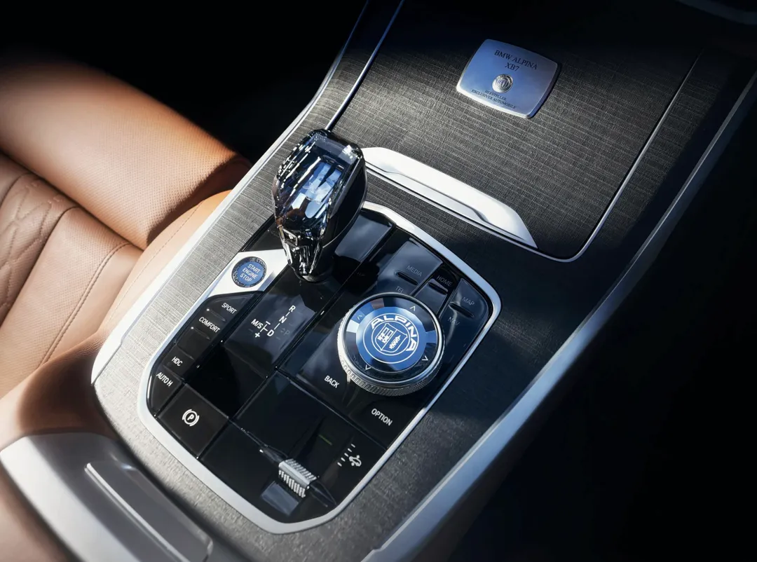 进入车内,BMW ALPINA XB7 MANUFAKTUR采用了采用Tartufo Merino真皮材质的铺陈,覆盖了座椅、门板四周以及中控台,触感柔软细腻。还加入了ALpina专属的天然黑胡桃木饰板,还可以选装Lavalina全真皮内饰(需要纯手工100小时制作)。中控台、迎宾踏板都配备了带有MANUFAKTUR浮雕的银色金属饰板,车内多处镶嵌“1/120”限量铭牌,包括中控台、后备箱地毯及B柱激光蚀刻标识。前排座椅的头枕带有手工刺绣的“Alpina”字样,并提供绿/蓝配色刺绣(呼应车漆)。第二排则配备了独立行政级长座椅,为长途行驶带来了更多的舒适感。中控台配备了12.3英寸液晶仪表 + 14.9英寸中控屏曲面连屏,搭载了BMW最新一代的iDrive系统,操作更加顺畅。还配备了经典的Alpina三辐式多功能方向盘、水晶换挡手柄、Bowers & Wilkins(宝华韦健)高端音响系统。
