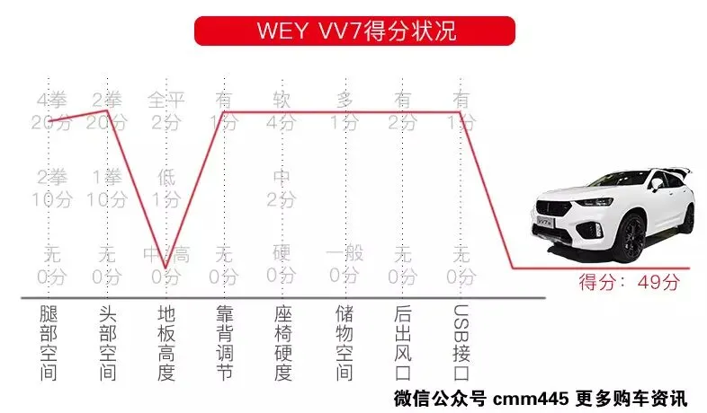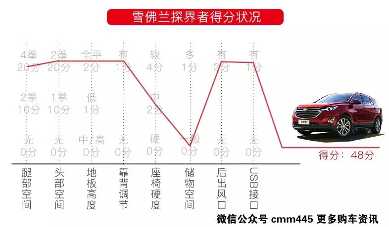 探界者比VV7优秀的地方就在于探界者后排地板全平,但是探界者的座椅不算柔软、储物空间也不算很多,相比较VV7来说在这些方面探界者做的还是不够。虽然探界者和VV7一样有着头部2拳腿部3拳4指的夸张空间表现,但是就后排表现而言相比较VV7还是略逊一筹,最终探界者以48分的成绩拿下第二名。