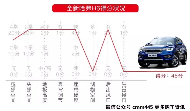 全新哈弗H6是这四台车中唯一一台紧凑型SUV,也是售价最低的一台,但是哈弗H6的表现却十分亮眼,后排头部2拳腿部3拳的表现值得称赞,座椅柔软地板全平加上空间宽敞,H6的后排可以好评,只是储物空间常规,加上没有USB接口成了H6的失分项。