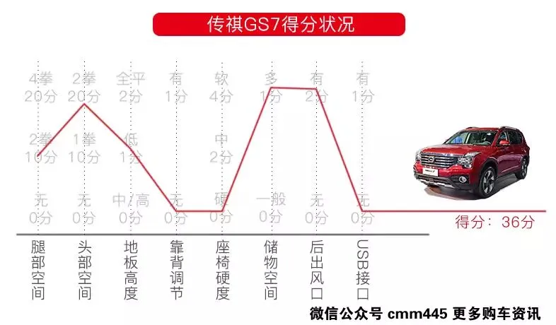 万众期待的传祺GS7在强者如云的情况下,只能排到最后,后排空间表现不及以上3个对手,座椅偏硬不够舒适,作为一台5排中型SUV来说靠背角度不能调节,地板没有全平、USB接口缺失,传祺GS7的后排乘坐起来确实让人不爽。目前只能希望厂家能够知己知彼,在上市前能够有所改进吧。