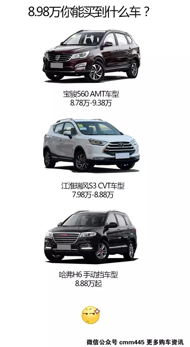 8.98万,呵呵,如果不算优惠的话,你能买哈弗H6最低配,连长安CS75最低配也买不到,如果你想买自动挡,那只能选择宝骏560 AMT,或者是江淮瑞风S3这类小型SUV车型了。