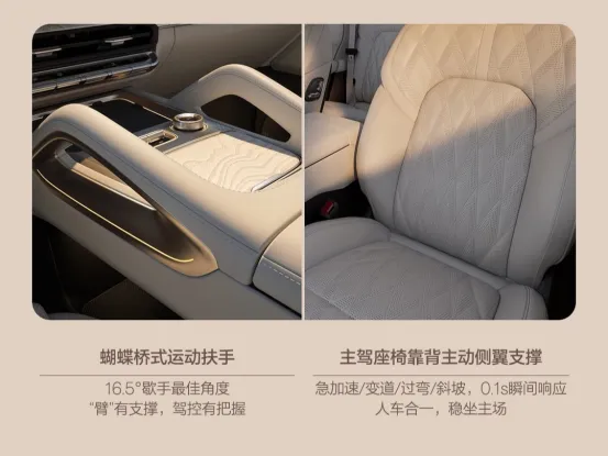 同时极氪8X中控下方有了蝴蝶桥式运动扶手,这个设计常见于很多传统豪华品牌的SUV,如保时捷卡宴、路虎卫士、奔驰GLE等,在激烈驾驶或者是越野路况下,配合主驾靠背的主动侧翼支撑,能够提供更好的支撑,让我们身体保持稳定。