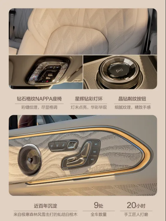 其次就是豪华的用料,极氪8X全车座椅采用Nappa真皮材质,一些实体金属按键周围都做了巴黎饰钉的装饰,旋钮以及前排上方的灯环都应用了水晶材质,中控部分以及门板上都有手工打造的白栓木饰板。
