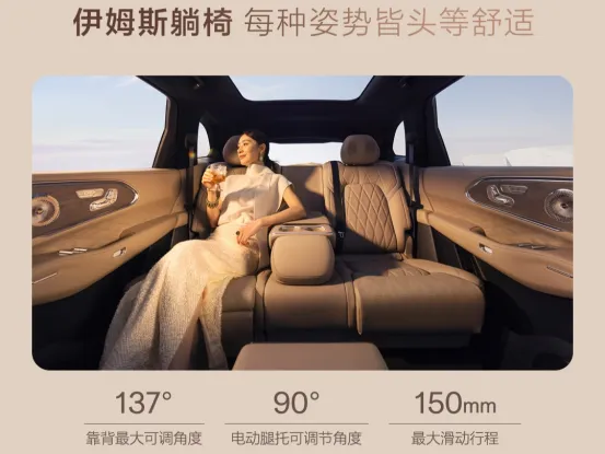 极氪8X后排两个座椅均支持通风、加热及22点SPA级按摩功能,座椅支持前后和靠背的电动调节,座椅角度最大可调至137°,最大滑动行程150mm。比较值得一说的是后排右侧的座椅,不仅配备了电动腿托,还有上翻式的电动脚踏,脚踏升起时我们的脚就无需人为躲避,这样就可以形成极氪高端车型标志性的伊姆斯躺椅。