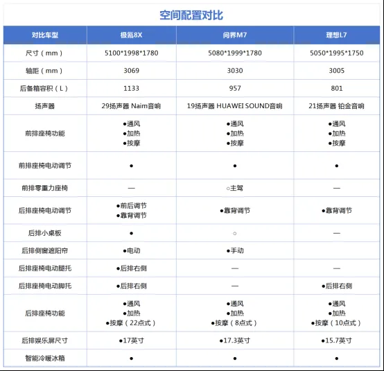 光是这样说可能不太直观,我们就结合官方已公布的配置信息,以及从实拍图中座椅按键获取的细节,拿极氪8X与问界M7、理想L7这两款大五座SUV标杆车型进行对比。可以发现,极氪8X在尺寸和配置方面,相比这两款车具备明显优势,称它为最豪华的大五座SUV或许并不为过。如果真要说它有什么遗憾?大概就是前排两个座椅未配备零重力功能了。