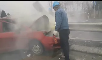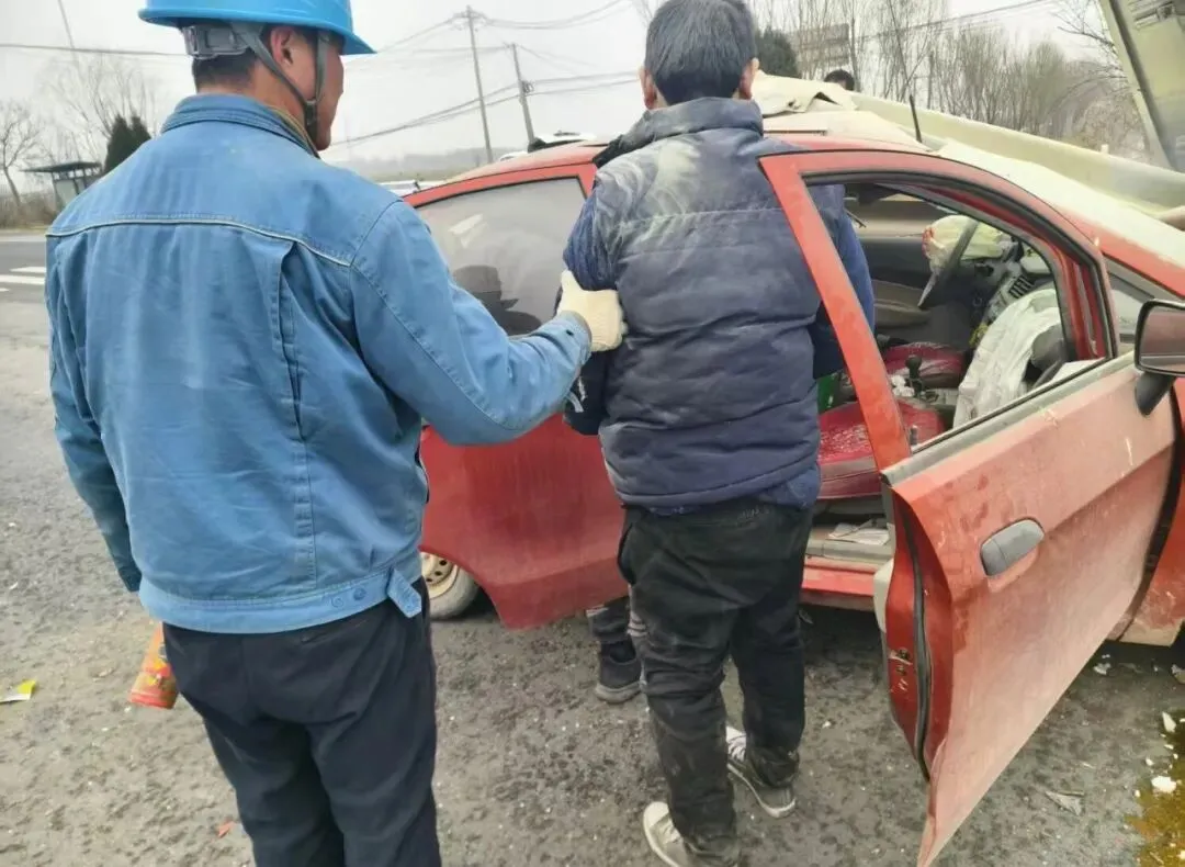 “快!分头行动!”危急时刻,韩祖建顾不上险情,迅速分工。他一边与同事呼叫司机,并合力尝试将其从变形的驾驶室中解救出来;另一边,孙业朋等人手持灭火器对准正在冒烟起火的车头一阵猛喷,全力压制火势,为救援争取宝贵时间。同时,他们还大声呼喊,引导周围热心群众帮忙拨打122交通事故报警电话和120急救电话。