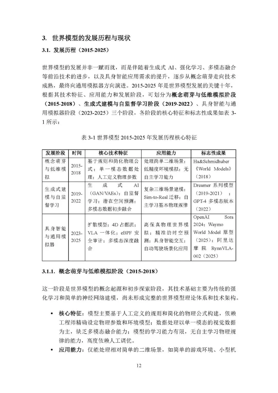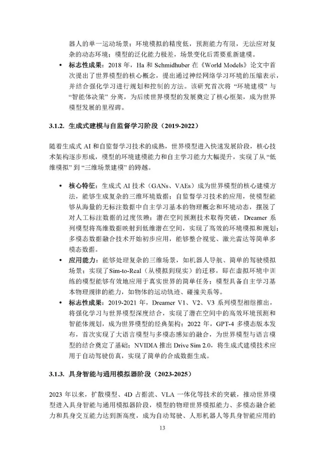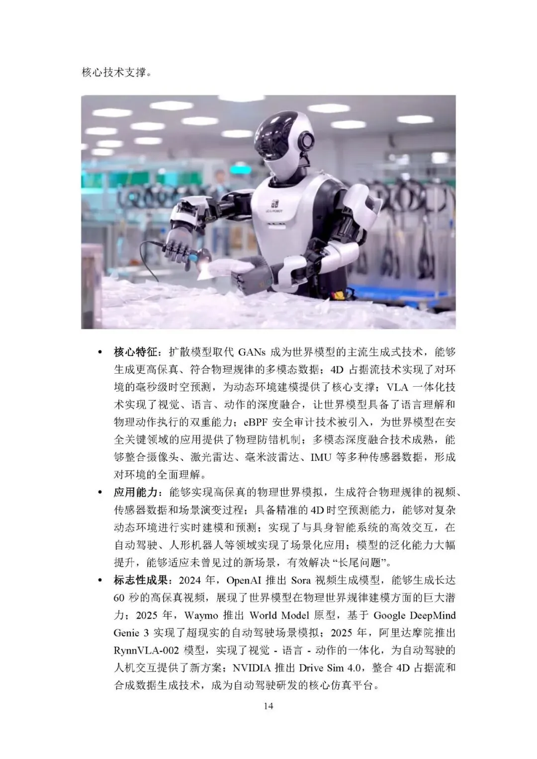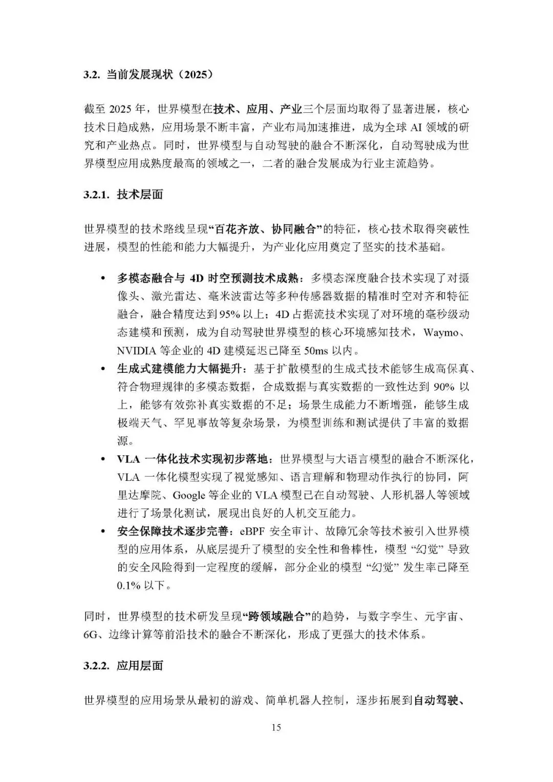 世界模型是整合多模态输入、构建物理世界抽象表示的生成式 AI 模型,核心特征为多模态融合、隐式物理规律涌现、反事实推理、感知 - 预测 - 行动闭环等,与传统 AI 模型(单一场景、依赖人工规则)、大语言模型(文本为主、缺乏物理交互)存在本质区别。其技术支撑涵盖生成式 AI、强化学习等基础技术,4D 占据流、VLA 一体化等关键技术,以及 GPU、专用 AI 芯片、云端集群的算力支撑,2015-2025 年历经概念萌芽与低维模拟、生成式建模与自监督学习、具身智能与通用模拟器三个发展阶段,2025 年在技术、应用、产业层面均取得显著进展,但仍面临技术路线不清晰、模型 “幻觉”、数据一致性不足、产业协同弱等瓶颈。