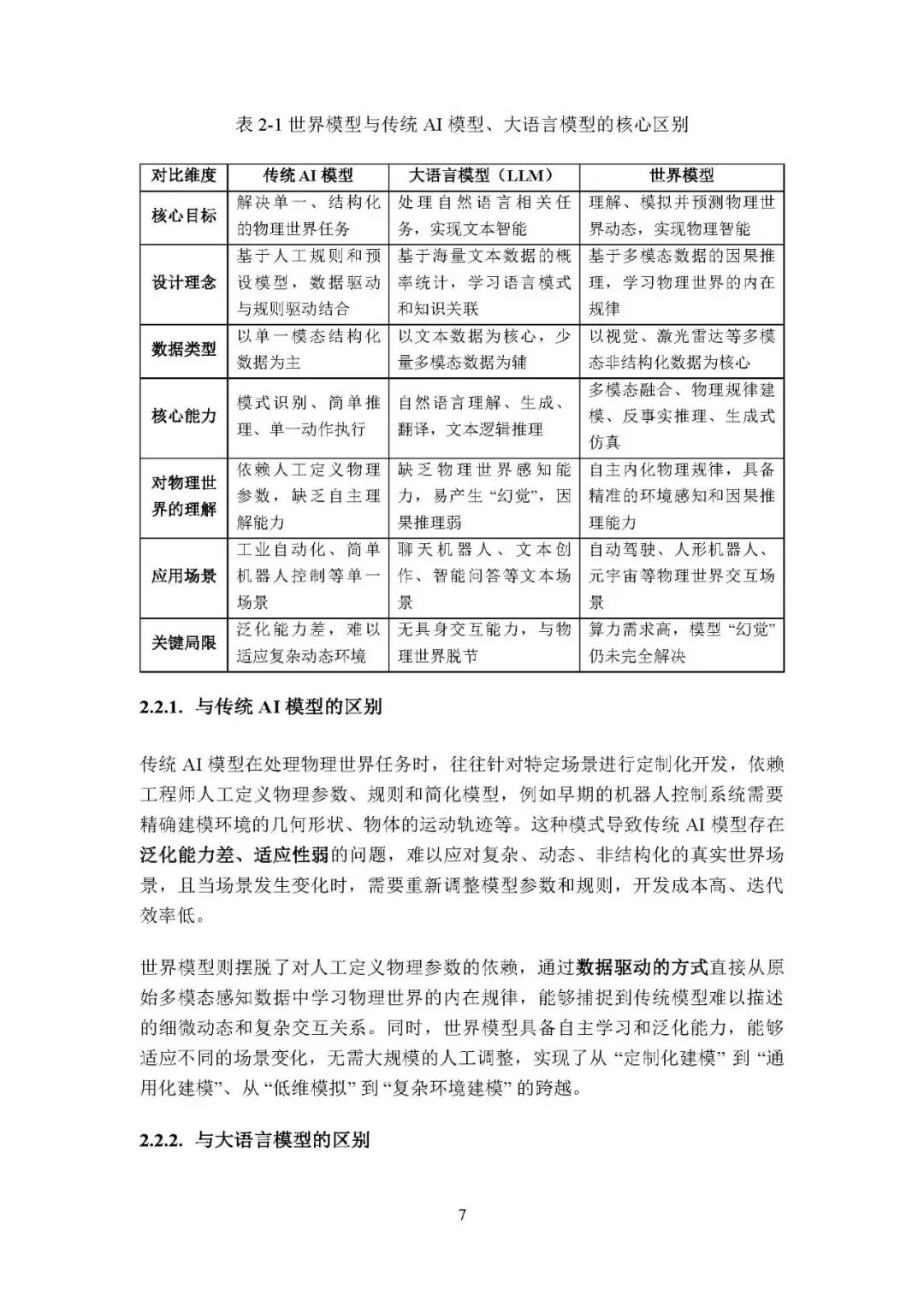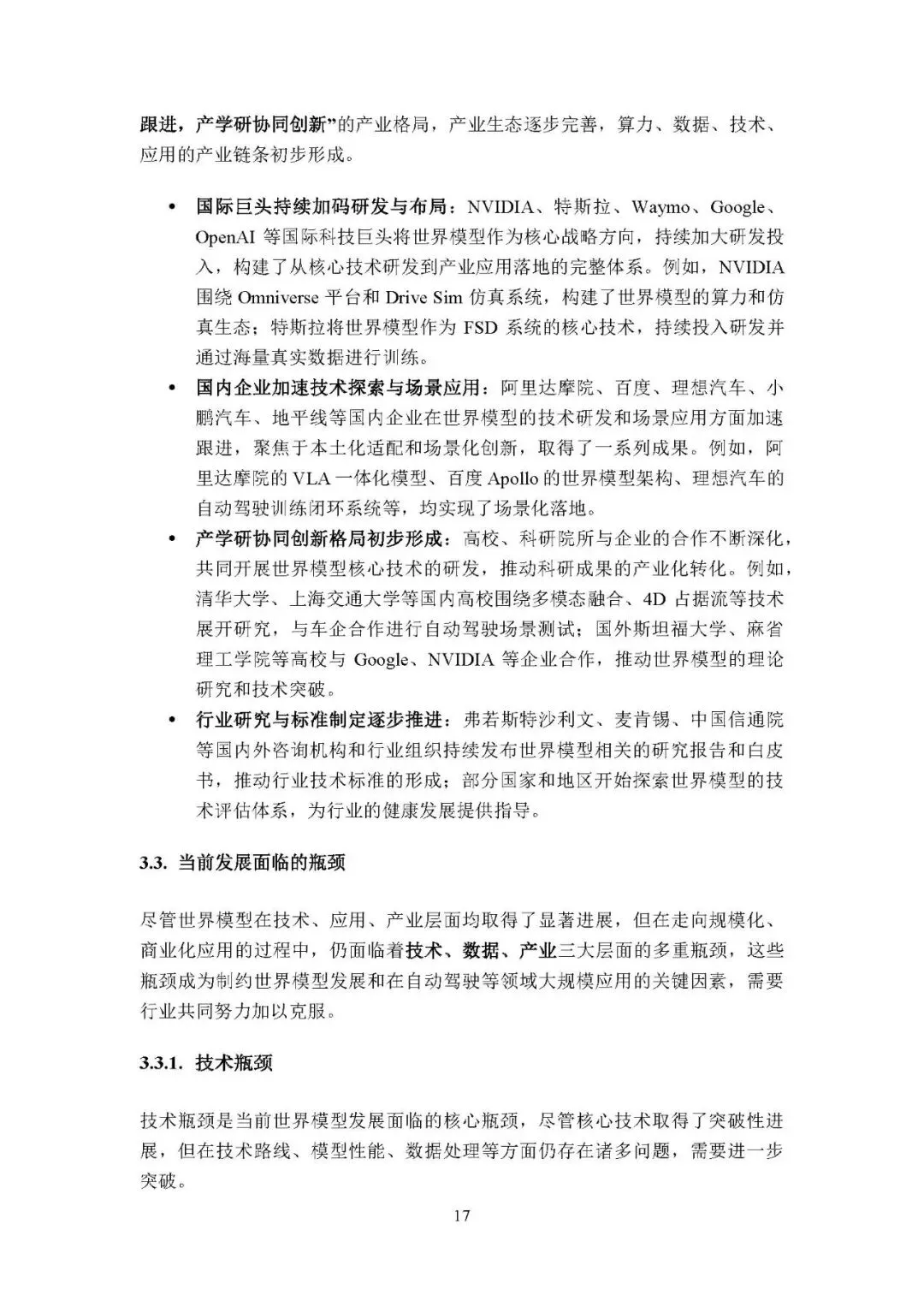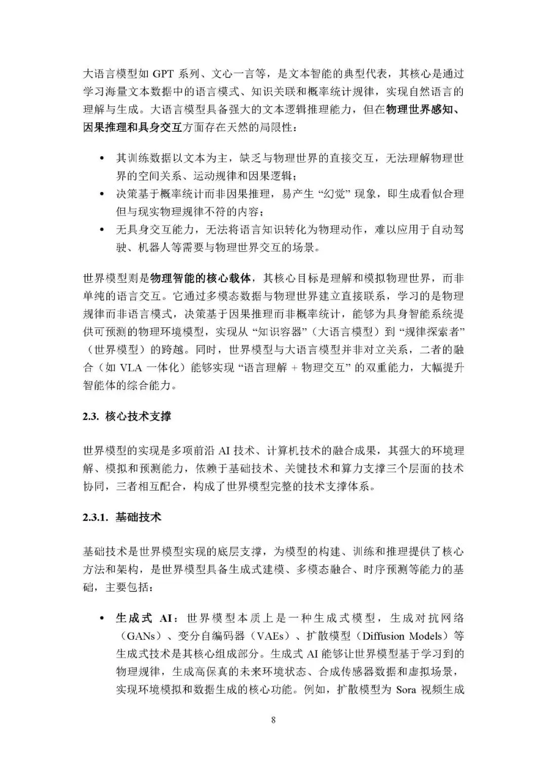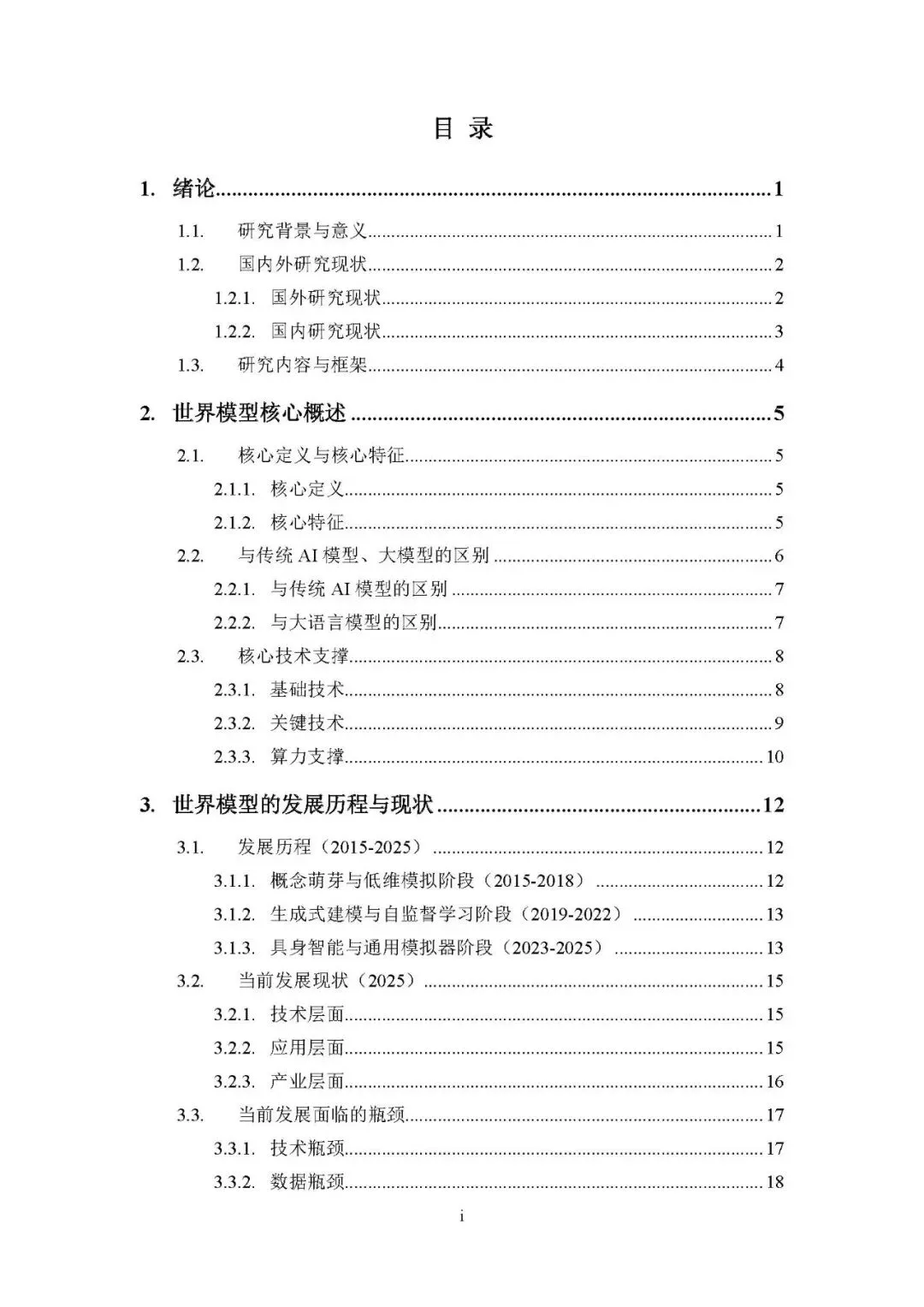 世界模型是整合多模态输入、构建物理世界抽象表示的生成式 AI 模型,核心特征为多模态融合、隐式物理规律涌现、反事实推理、感知 - 预测 - 行动闭环等,与传统 AI 模型(单一场景、依赖人工规则)、大语言模型(文本为主、缺乏物理交互)存在本质区别。其技术支撑涵盖生成式 AI、强化学习等基础技术,4D 占据流、VLA 一体化等关键技术,以及 GPU、专用 AI 芯片、云端集群的算力支撑,2015-2025 年历经概念萌芽与低维模拟、生成式建模与自监督学习、具身智能与通用模拟器三个发展阶段,2025 年在技术、应用、产业层面均取得显著进展,但仍面临技术路线不清晰、模型 “幻觉”、数据一致性不足、产业协同弱等瓶颈。