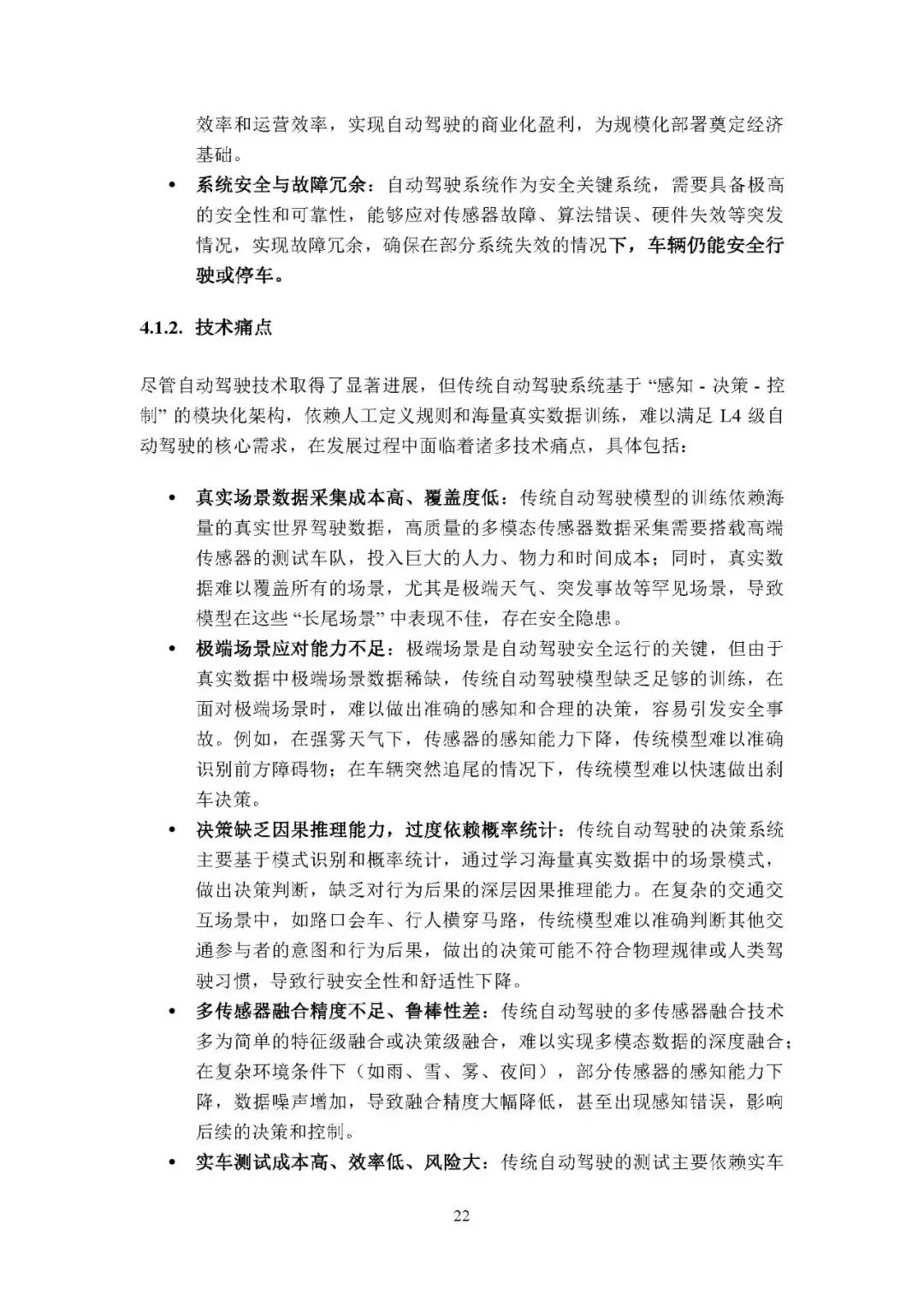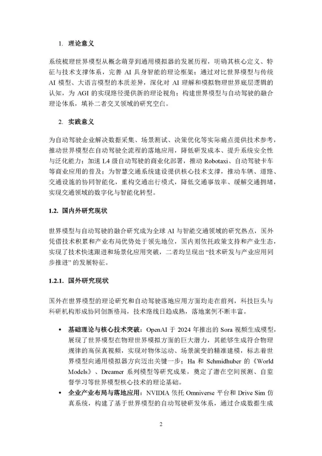 人工智能正从文本智能向物理智能跨越,自动驾驶也处于从 L2/L3 向 L4 级突破的关键期,传统自动驾驶系统存在数据成本高、极端场景应对弱、因果推理不足等痛点。世界模型作为实现通用人工智能(AGI)与具身智能的核心技术,能理解、模拟并预测物理世界动态,成为解决自动驾驶行业痛点、推动其技术升级的核心驱动力,研究二者融合兼具完善具身智能理论的学术价值,和加速 L4 级自动驾驶商业化、构建智慧交通的实践价值。