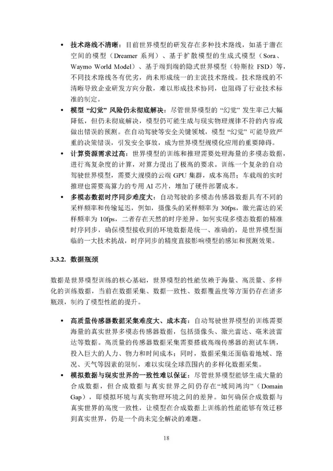 优势体现在全流程降本增效(数据成本降 60% 以上、替代 80% 实车测试)、多维提升行驶安全性(事故率降 70% 以上)、突破技术瓶颈加速 L4 级落地、增强泛化能力适配全场景;挑战主要来自四方面,技术上模型 “幻觉” 难根除、多模态融合精度不足、可解释性差,成本上高算力硬件、研发及运营投入高昂,数据上合成数据与现实校准难、极端场景数据验证难、隐私安全及数据共享问题突出,伦理合规上决策责任界定模糊、算法歧视、法律法规与技术发展不同步、行业标准缺失。