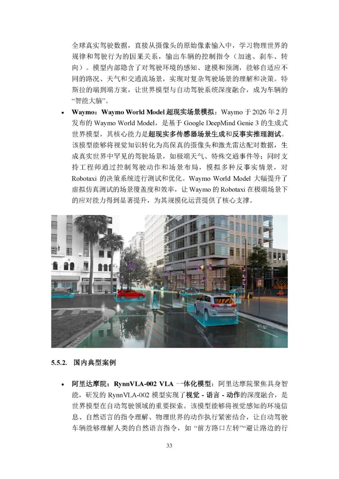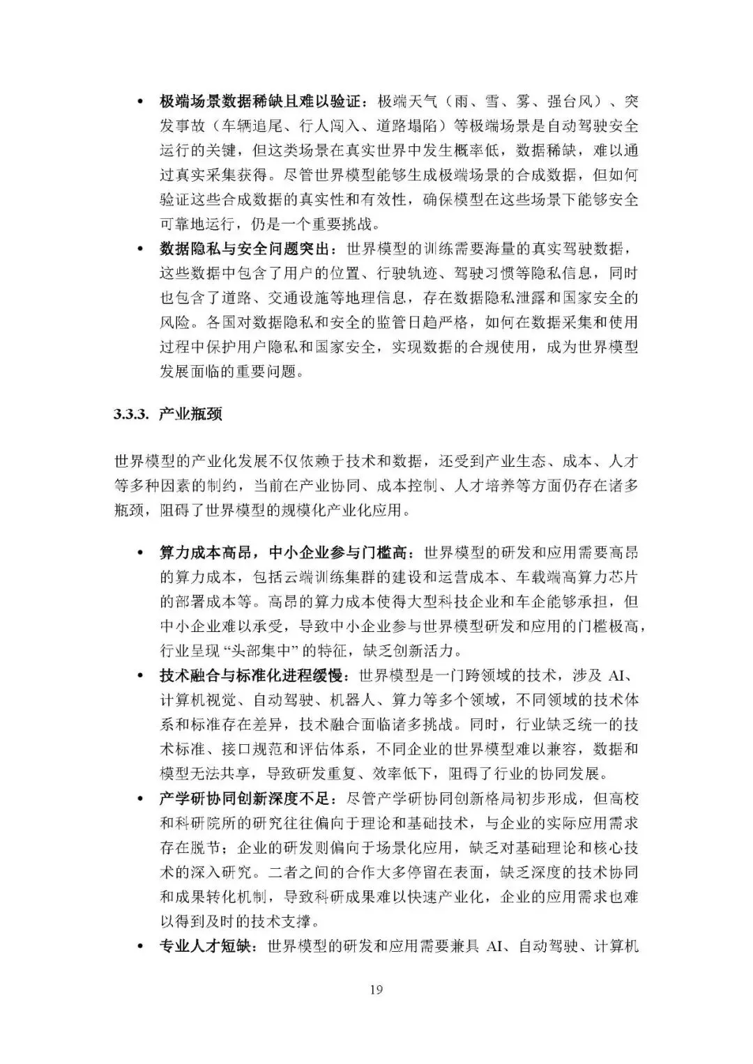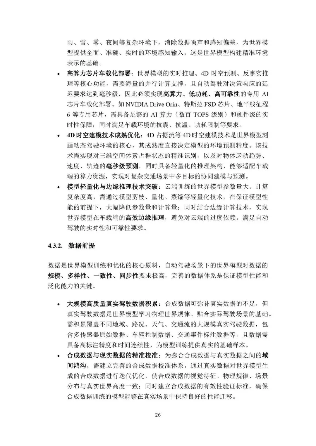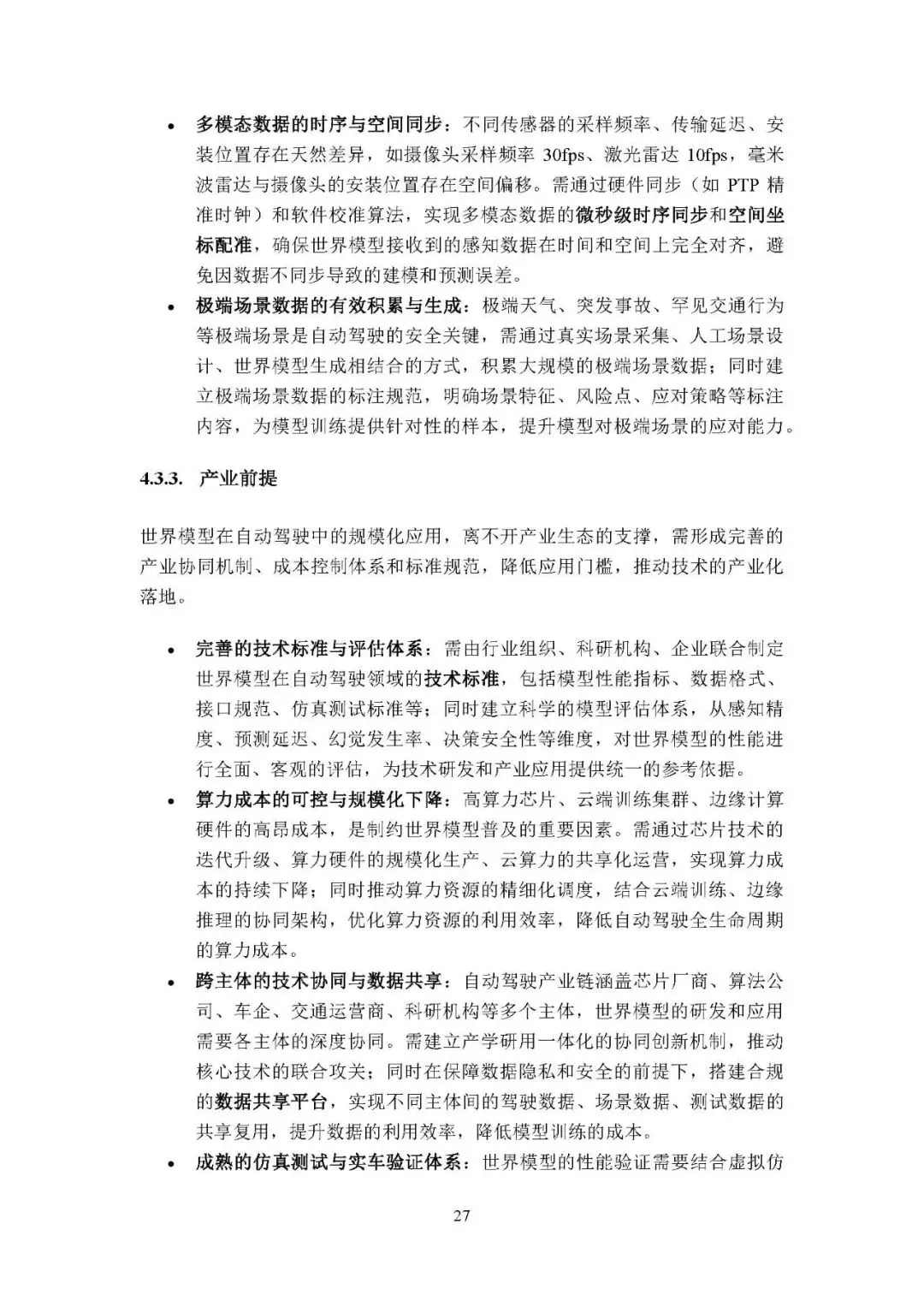 短中长期发展前景清晰:短期(1-3 年)实现技术优化,在园区、港口等封闭场景规模化应用,合成数据成为行业标配;中期(3-5 年)核心技术成熟,L4 级自动驾驶在开放道路规模化落地,形成完整产业链;长期(5 年以上)世界模型通用化并与 AGI 融合,自动驾驶全面普及,重构交通出行模式,推动智慧交通与智慧城市建设。为突破挑战,从技术研发(攻关核心瓶颈、推动跨领域融合、研发轻量化技术)、产业协同(构建产学研协同机制、搭建共享算力数据平台、推动规模化降本)、政策扶持(完善法律法规与伦理体系、建立统一标准、加大政策扶持、加强数据监管)三个维度提出具体发展建议。