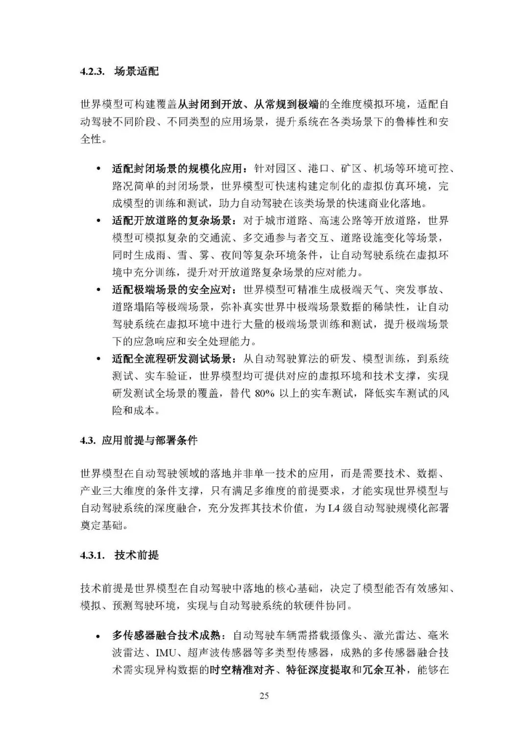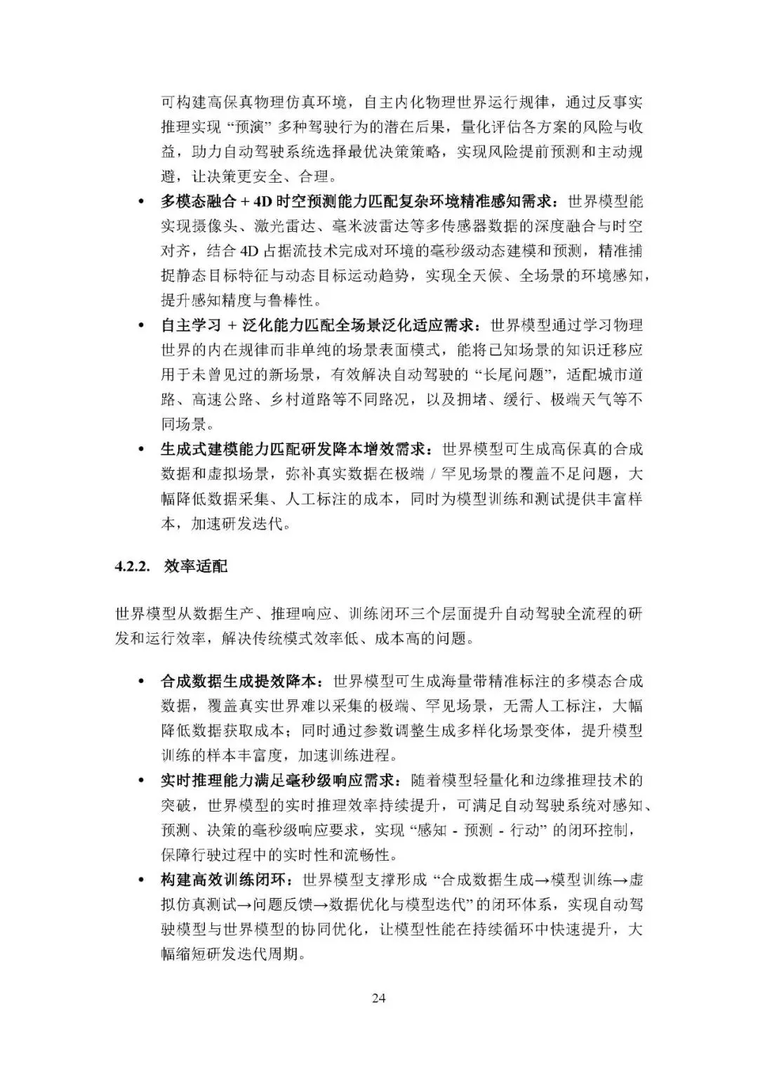 自动驾驶核心需求围绕安全、高效、泛化、降本展开,世界模型从能力(核心技术匹配感知、决策、泛化等需求)、效率(合成数据降本、实时推理提效、构建训练闭环)、场景(适配封闭 / 开放 / 极端场景及全流程研发测试)三个维度与自动驾驶高度适配。其落地需满足技术(多传感器融合、高算力芯片车载化等)、数据(大规模真实数据、合成与现实数据校准等)、产业(统一标准、算力成本可控、跨主体协同等)三大前提。