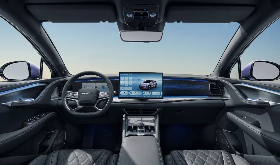 空间上座舱采用“海洋环抱式”设计,软性材质包裹中控台,15.6英寸可旋转中控屏兼具科技感与豪华感。仿皮座椅前排支持12向电动调节+腿托,后排靠背角度可调,全景天窗营造通透氛围。2930mm轴距带来越级空间,后排腿部空间超两拳半,即使身高185cm的乘客也能轻松跷二郎腿,后备箱常规容积552L,拓展后达1410L,满足家庭出行储物需求。
