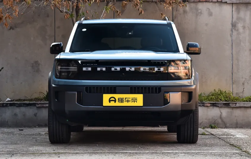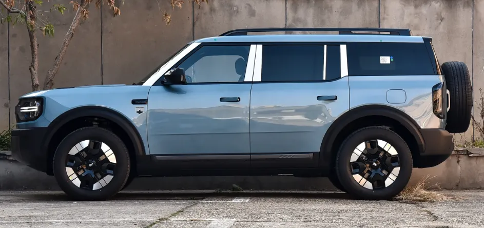 外观这块儿,我先看一下这个前脸,它还是保留了烈马家族那个方盒子的造型,然后这个前脸有个“BRONCO”字母可以点亮的,晚上开着还挺有辨识度的。然后侧面的话,这个车它在尺寸上是真的大, 车长超过5米,轴距2米95 ,比方城豹5和那个坦克400Hi4-T都要大一点点。车尾这块儿还是侧开式的尾门,然后外挂式备胎,看着就是很有那个越野车的范儿。