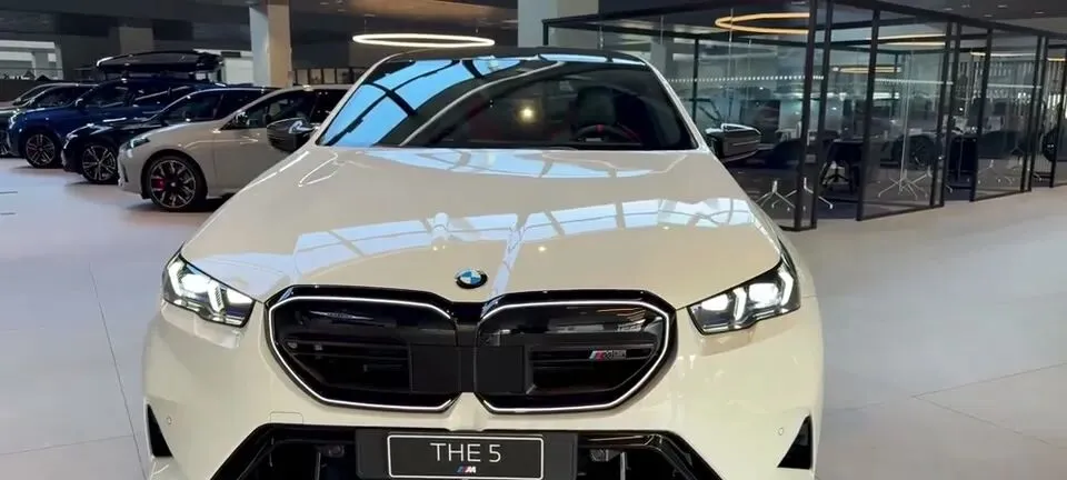 “展示2026款宝马M5轿车的外观,前脸设计,双肾格栅采用黑色涂装,搭配白色车身,运动感十足。”