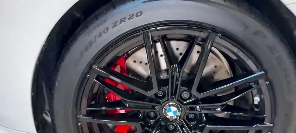 “展示2026款宝马M5轿车的轮毂设计,黑色多辐轮毂搭配红色卡钳,运动感十足。”