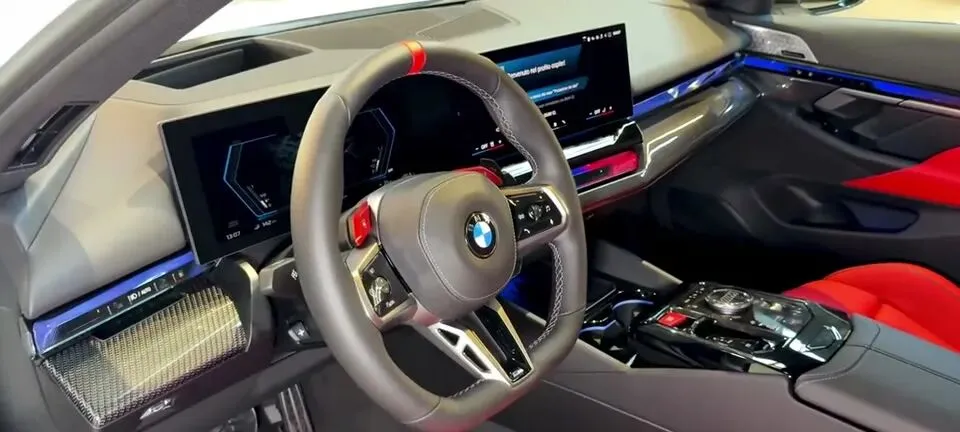 “展示2026款宝马M5轿车的内饰,红色座椅搭配碳纤维饰板,运动感十足。”