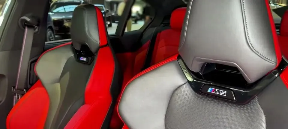 “展示2026款宝马M5轿车的后排空间,红色座椅搭配碳纤维饰板,运动感十足。”