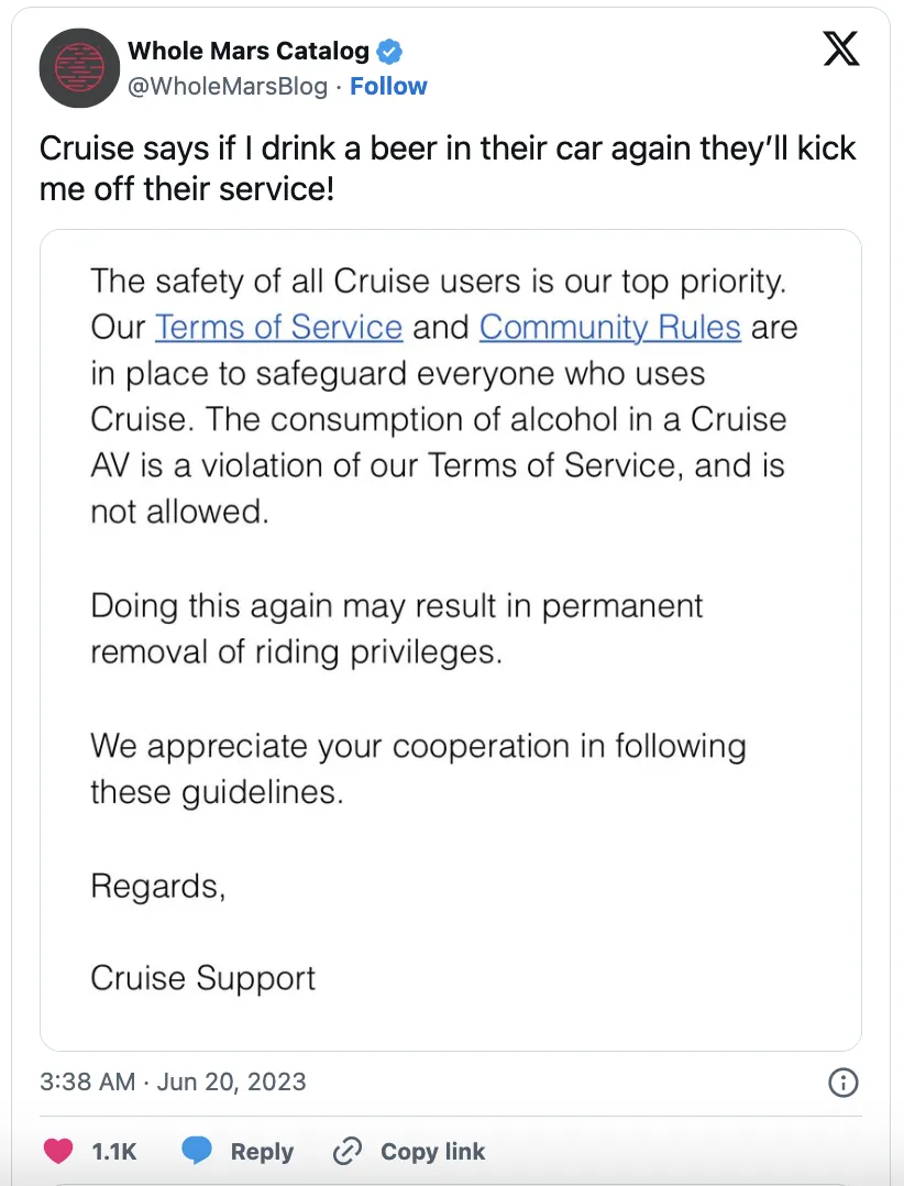 Cruise 对于在自动驾驶出租车中饮酒的乘客发出书面信|X除了公司自己制定的 2 规则,加州车辆法在这方面也进行了非常明确的规定:禁止司机和乘客在公共道路上饮酒、吸食大麻或在车内持有任何一种物质的开放式容器。但是,加州法律可能存在一个小漏洞:开放式容器法律不适用于「公共汽车、出租车或出租豪华轿车」中的乘客。这就导致,迄今为止,负责监管州车辆法规的加州公路巡警仍无法确认该法规如何适用于 Robotaxi。简而言之,自动驾驶出租车还是太新了,围绕 Robotaxi 的规则和法规还需要不断完善。虽然「性行为」本身并不违反规定,但乘客在车内的活动会受到监控。Waymo 和 Cruise 的车内和车外都有摄像头。两家公司都说这是出于安全和维护目的,但你的性爱行为被记录下来的几率很高。另外,车窗没有着色,所以车外的人也有可能看到车内发生的一切。Cruise 在其网站上写道。「我们在车内录制视频,以提高安全性和支持性,如果您在乘车过程中发生了意外,我们可能会查看录像,以便更好地了解发生了什么。我们只在乘客主动支持呼叫时录制音频。」Waymo 也表示,「如果对清洁、安全、撞车或丢失物品有担忧,其团队可能会查看录像。」反对者认为自动驾驶汽车的「监控」会极大的侵犯的人们的隐私权。毕竟,不难想象,「监控数据」会成为私营公司非法牟利的手段;而自动驾驶汽车(AV)还有很可能变成「监控工具」,因为这些汽车装有摄像头和其他传感器,一旦执法部门提出要求,车辆记录的数据就会被移交给执法部门——在旧金山,警方已经要求 Waymo 和 Cruise 提供无人驾驶汽车录像,以帮助破案。
