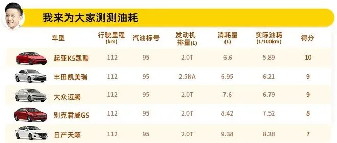 (由于编队行驶,头车起亚K5凯酷可以更好的控制车速,其他4台车因追逐前车会有急加速和急刹车的情况出现,所以平均油耗会有0.1L左右的误差。)