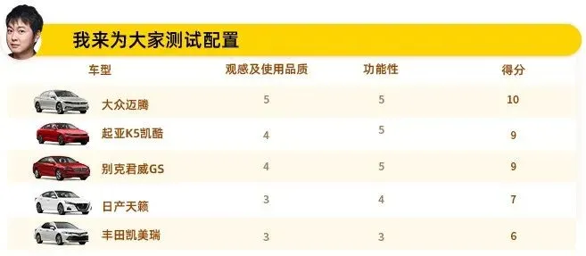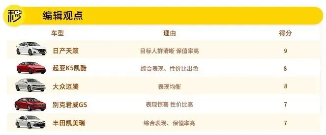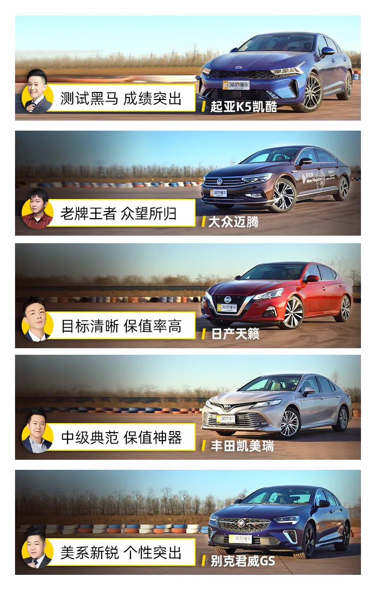 总体而言,这几台车均处在合资中型轿车的第一梯队,因此也可以看出每台车非常明显的性格,这就造成了每台车都有着不同的车主画像。大众迈腾凭借着稳重的颜值和车内表现,作为一台宜商宜家的车型再合适不过了;起亚K5凯酷是五台车中最年轻的,因此它有着最新的配置技术和超高的性价比,成为了年轻人的不二之选;丰田凯美瑞绝对是家庭用车的首选车型,皮实、耐用、保值就是我们想看到的;日产天籁与凯美瑞相同,同样有着非常好的性价比和保值率;别克君威GS的性格就非常明显了,强悍的优惠力度会给你惊喜,对于喜欢运动表现的小伙伴,买它没有错。