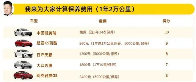 而丰田凯美瑞凭借着几乎免费的保养价格和高保值率为它得到了不少分数。