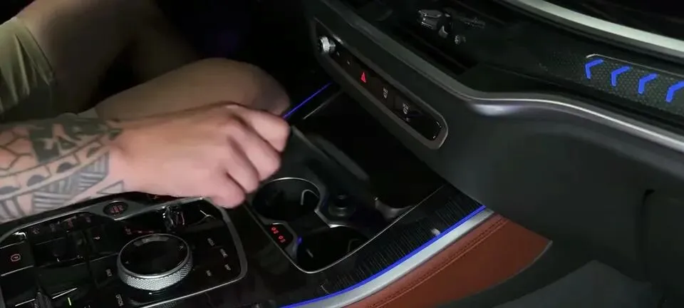 原句直引:“展示宝马X5的内部中控台细节,包括杯架和控制按钮。”