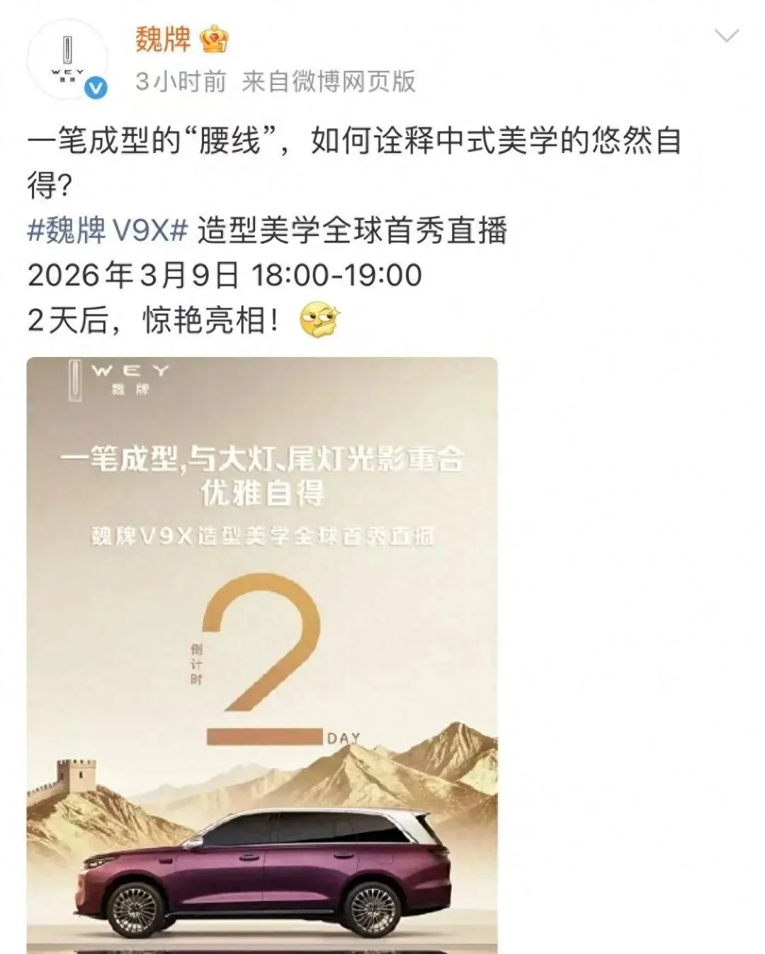 长城魏牌最近放出了个大招——全新大型SUV V9X确定在3月9日正式亮相。作为品牌首款基于归元S平台打造的车型,这款车直接瞄准了家用市场,采用六座布局,还用上了2.0T插电混动系统,连长城汽车董事长魏建军都亲自为它代言,可见其重要性。目前虽然还没公布具体价格,但从定位来看,它比自家的中大型SUV蓝山(官方指导价29.98万起)还要高,预计入手门槛会再往上走。不过现在国内大型新能源SUV市场竞争挺激烈,像领克900、腾势N9、智己LS9这些“9”字辈车型都虎视眈眈,V9X想突出重围,定价可得好好琢磨琢磨。