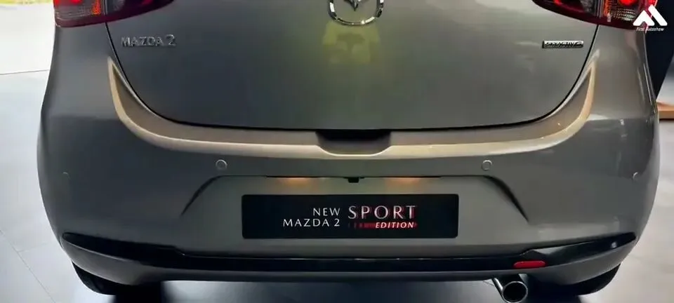 “展示马自达2的后方外观,尾灯设计独特。”