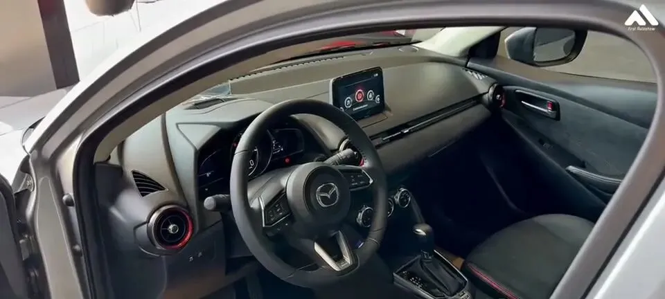 “展示马自达2的内饰全貌,方向盘、仪表盘、中控屏幕等。”