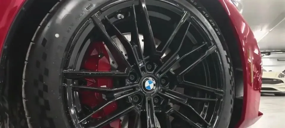 “展示2026 BMW M5 Sedan的黑色轮毂和红色刹车卡钳。”