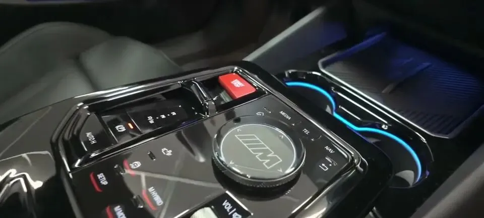 “展示2026 BMW M5 Sedan的中控台细节,包括控制按钮、杯架等。”