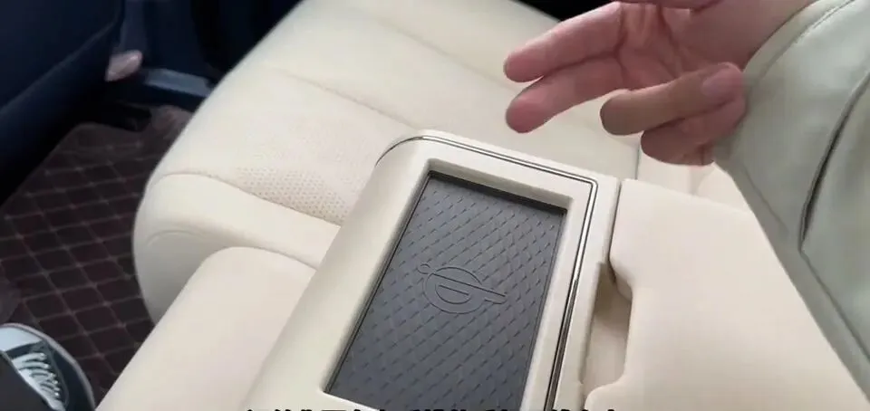 后排这个中央扶手上,还给你配备有后排的手机无线充电,大家能接受了吗?这里呢也是有小储物格,水杯座是这种弹出式的方式,很有仪式感的设计。