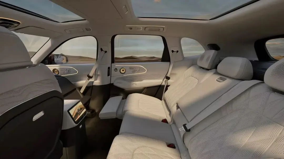 后排搭载的伊姆斯躺椅系统,支持 137° 躺角调节和四向电动腿托,配合 150mm 超长滑轨,3069mm 的轴距在 1.8 米身高乘客落座后,膝部余量仍有三拳。