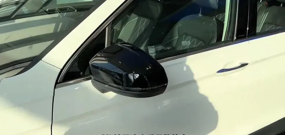 这辆新款车型,后视镜是这个熏黑的外壳,搭配上这个白色车身,形成了一种熊猫配色。