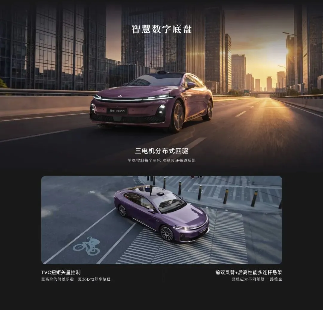 第一个是动力总成,昊铂A800全系采用了增程式,虽然CLTC纯电续航220km,但是在配合1.5T增程器的情况下,满油满电的综合续航里程超过1,200km,再加上三电机四驱,好处自然不用多说。