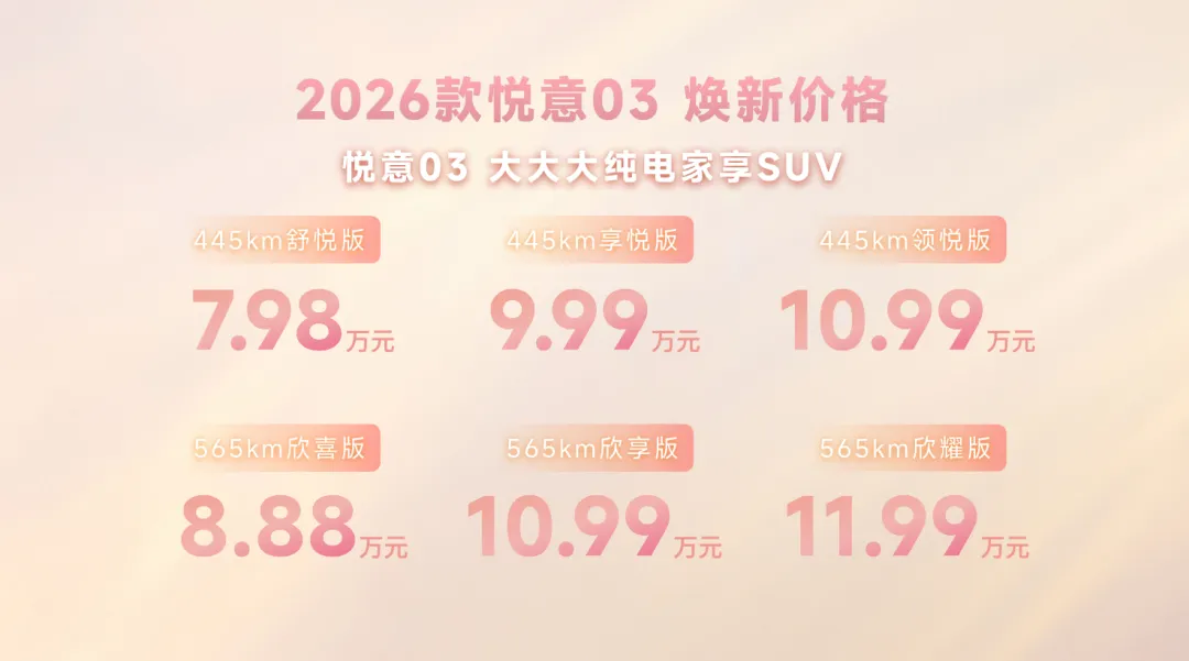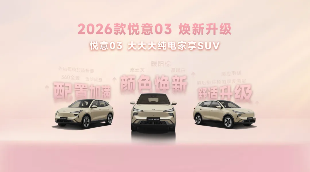近日,2026款悦意03正式完成焕新上市,这款主打“纯电家享SUV”定位的车型,围绕年轻家庭的日常出行需求完成20余项升级,一口气推出6款配置车型,官方指导价锁定7.98万-11.99万元,以越级的产品力和亲民的定价,刷新了同级市场的性价比门槛。