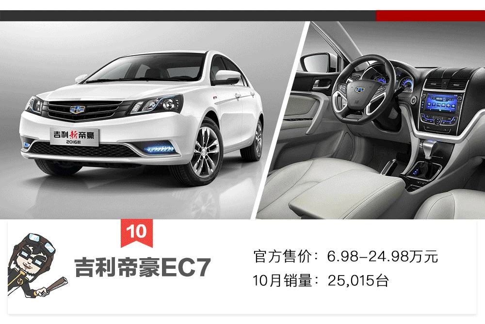 砖叔点评:帝豪EC7是唯一一台入门前十的自主品牌车型。作为自主紧凑级轿车常年的销量冠军,帝豪EC7不亚于合资车的整车品质是它一直热销的关键原因,而且,价格也真的不高,比同级合资车要便宜不少。