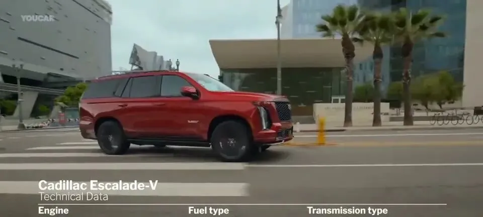 素材还给到动态画面——“凯迪拉克凯雷德V系列红色车身前脸行驶展示,展示其运动性能。”