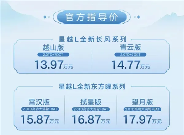 3月9日消息,今晚,吉利星越L长风版上市,新车共推出2款车型,售价区间为13.97-14.77万元,限时价12.47-13.27万元。