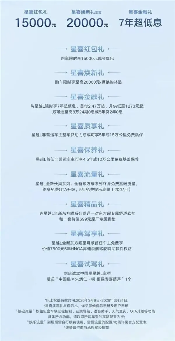 此外,购车可享7年超低息等多重福利,包括包括星喜红包礼、星喜焕新礼、星喜金融礼、星喜质享礼、星喜保养礼和星喜流量礼等。